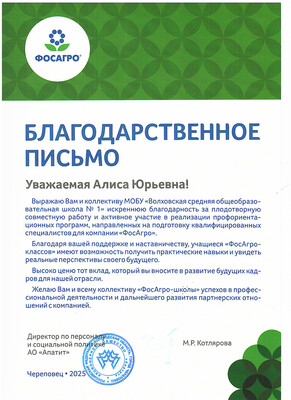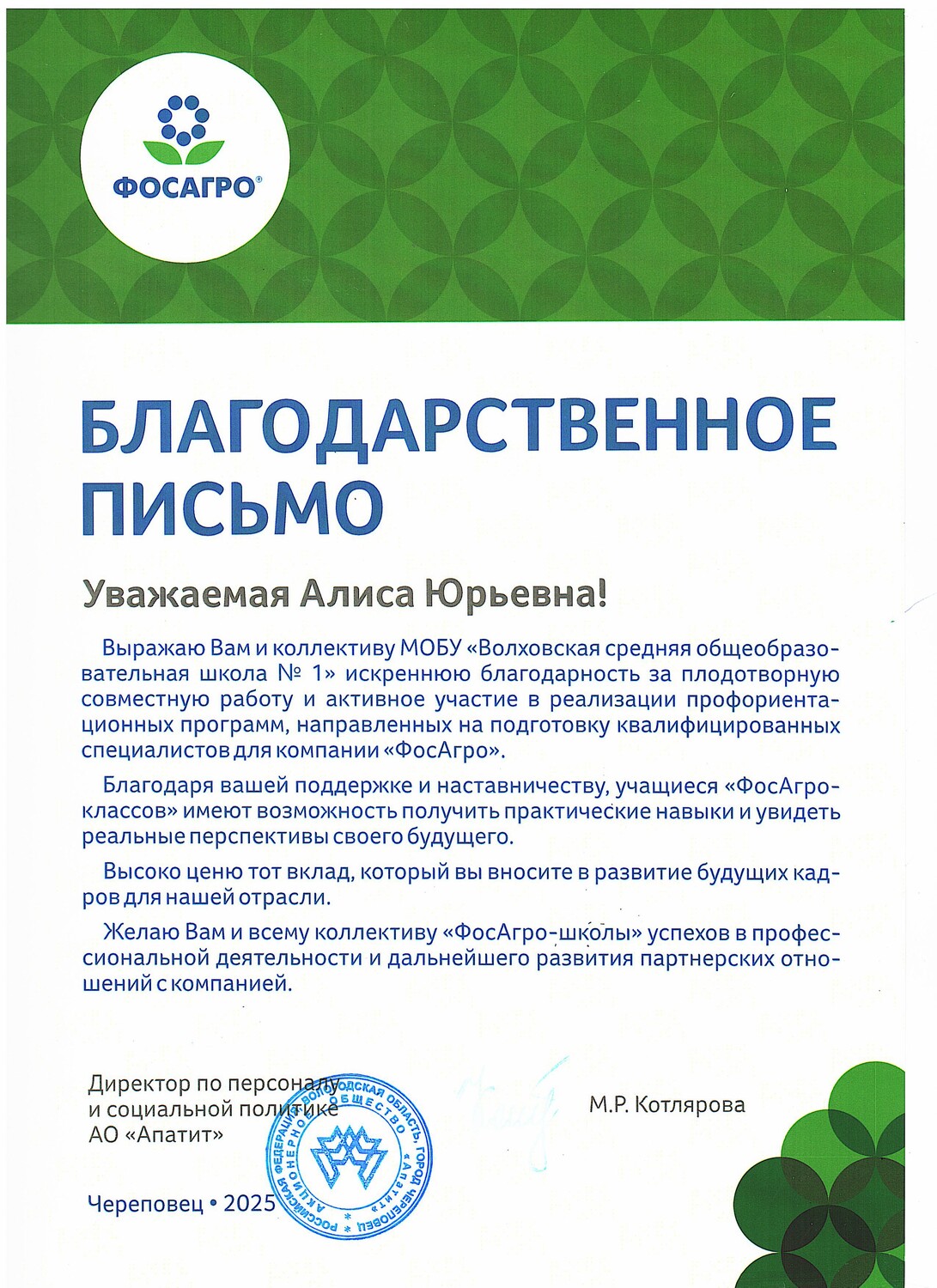 Благодарственное письмо коллективу Волховской СОШ № 1 от директора по персоналу и социальной политике АО « Апатит», г. Череповец, 2025 г.
