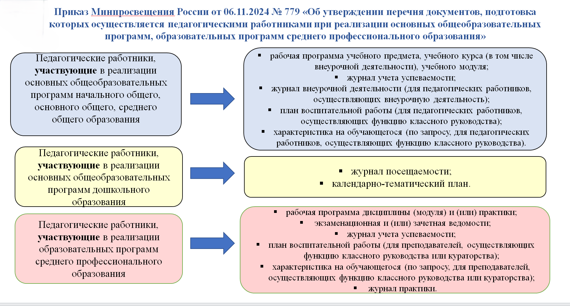 Приказ Минпросвещения России от 6 ноября 2024 года № 779 «Об утверждении перечня документов, подготовка которых осуществляется педагогическими работниками при реализации основных общеобразовательных программ, образовательных программ среднего профессионального образования»