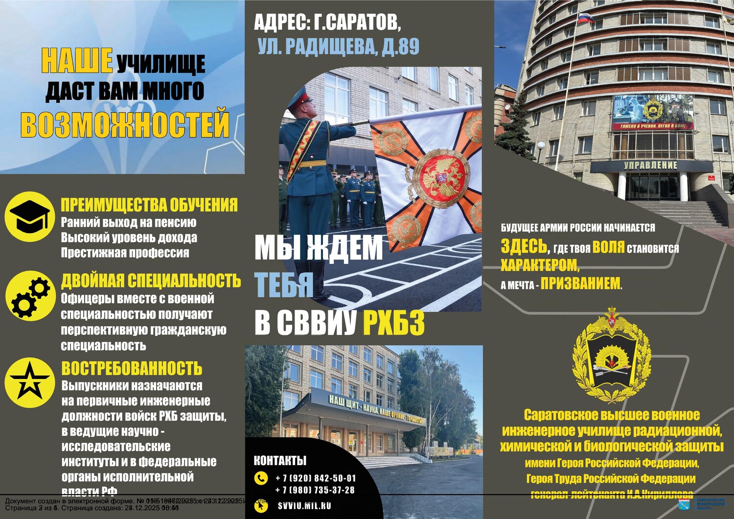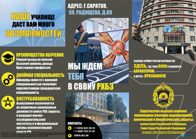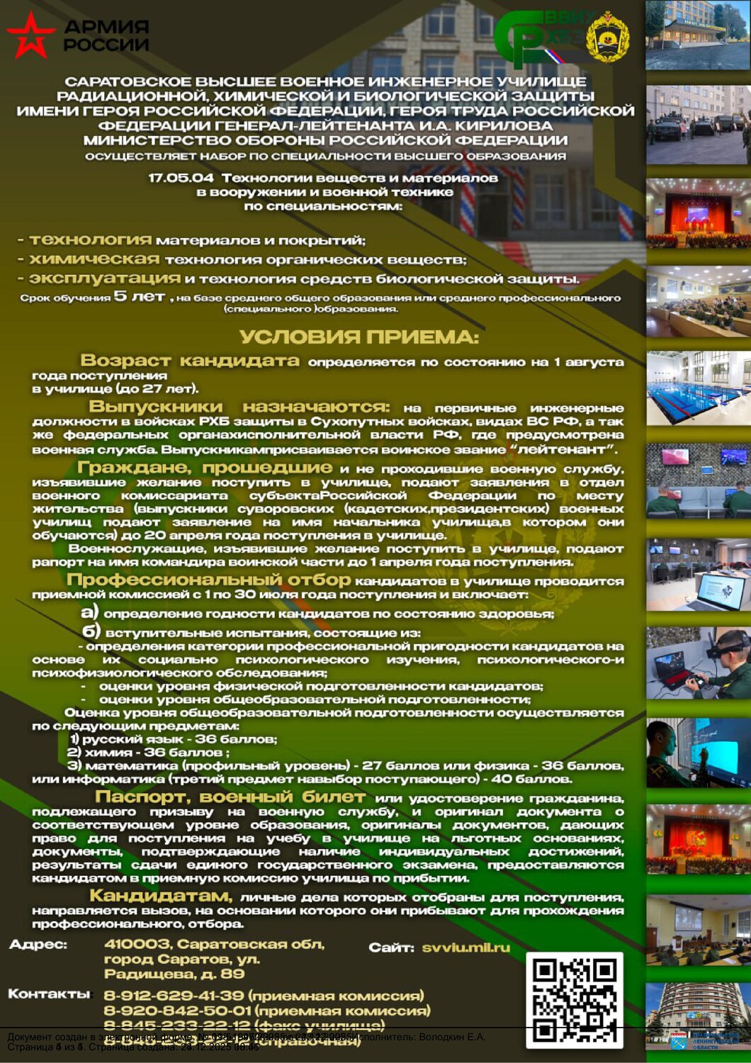 ФГКВОУ ВО «Саратовское высшее военное инженерное училище радиационной, химической и биологической защиты имени Героя Российской Федерации, Героя Труда Российской Федерации генерал-лейтенанта И.А. Кириллова» осуществляет набор по специальности высшего образования "Технологии веществ и материалов в вооружении и военной технике" по специализациям: